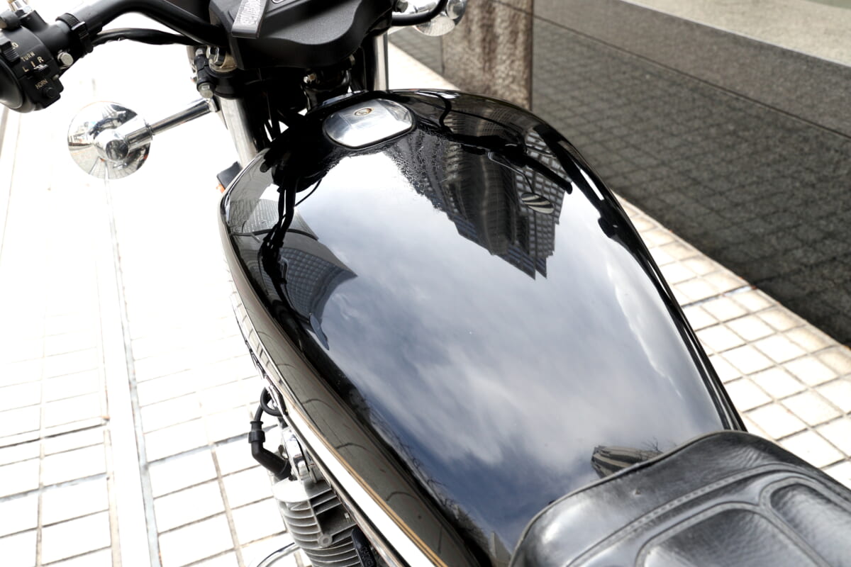 セ「さっき話したとおり、まずこの上から見たときのタンクの太さですね。それとテールランプの角張った感じ。丸みと角張ったデザインのバランスがいいなと思います。タンクからテールへのライン、大きめなウインカーも、スターキャストホイールも、全部気に入ってますね」