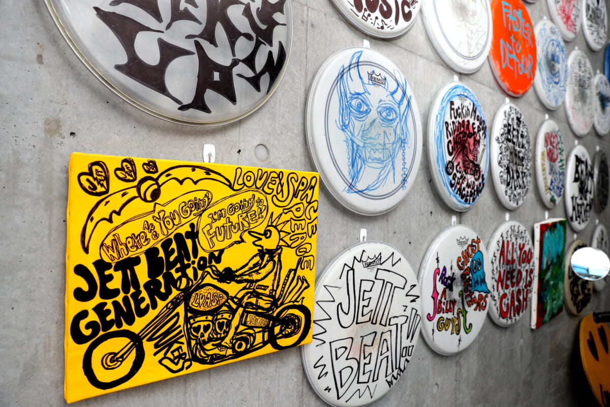 セ「僕がスネアのヘッドに描いた絵です。オーダーを受けてヘルメットにも描いています」