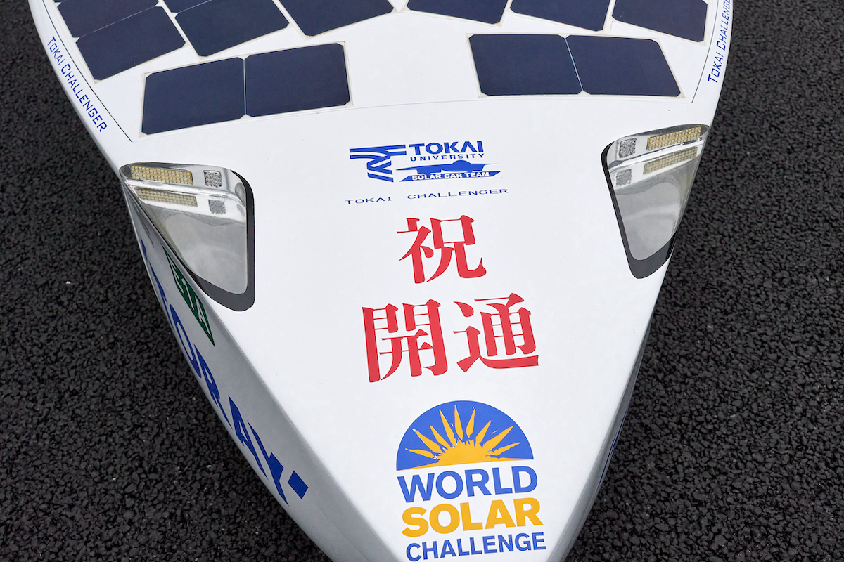 そしてもうひとつ、注目の“クルマ”が参戦しました。先導車に続き、パレードの先頭を務めたのは、見覚えのある流線形のボディ! GetNavi webでは何度か取材してお馴染みの、東海大学のソーラーカー「東海チャレンジャー号」です。