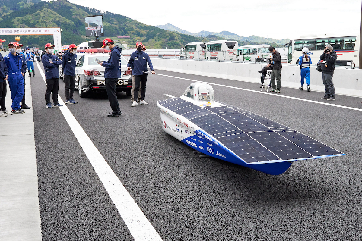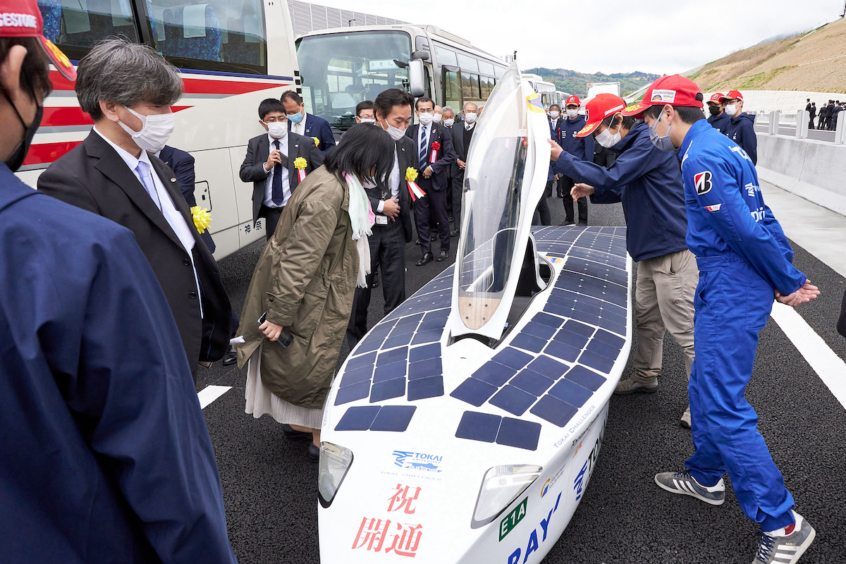 とは、今年度から学生代表を任されている東海大学工学研究科 修士1年の宇都一郎さん。実際に走行した感覚は「オーストラリアの広大な大地を走行している感覚に似ていた」とのこと。タイヤが細く、風の影響も大きく受けるソーラーカーでも静かに走行できたのは、新東名ならではかもしれませんね。