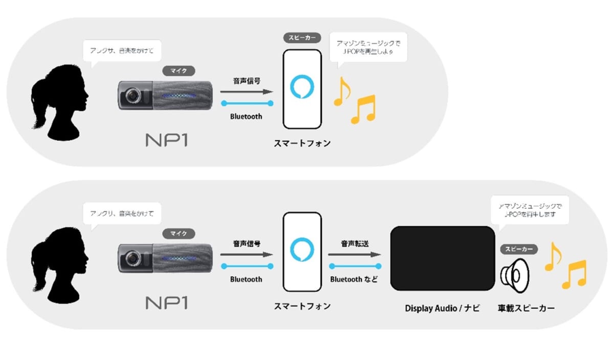 では、アレクサへの対応により、NP1はどんな進化を遂げるのでしょうか。よく使われるものとしては、音楽再生やニュース、天気予報などが挙げられます。音楽ならあらかじめBluetooth経由でカーオーディオと接続しておくことで、聴きたい曲がカーオーディオの迫力あるサウンドで楽しめるようになります。特にAmazon Primeの契約をしておけば約200万曲のコンテンツから聴きたい楽曲が音声で呼び出せるようになるのは大きな魅力です。