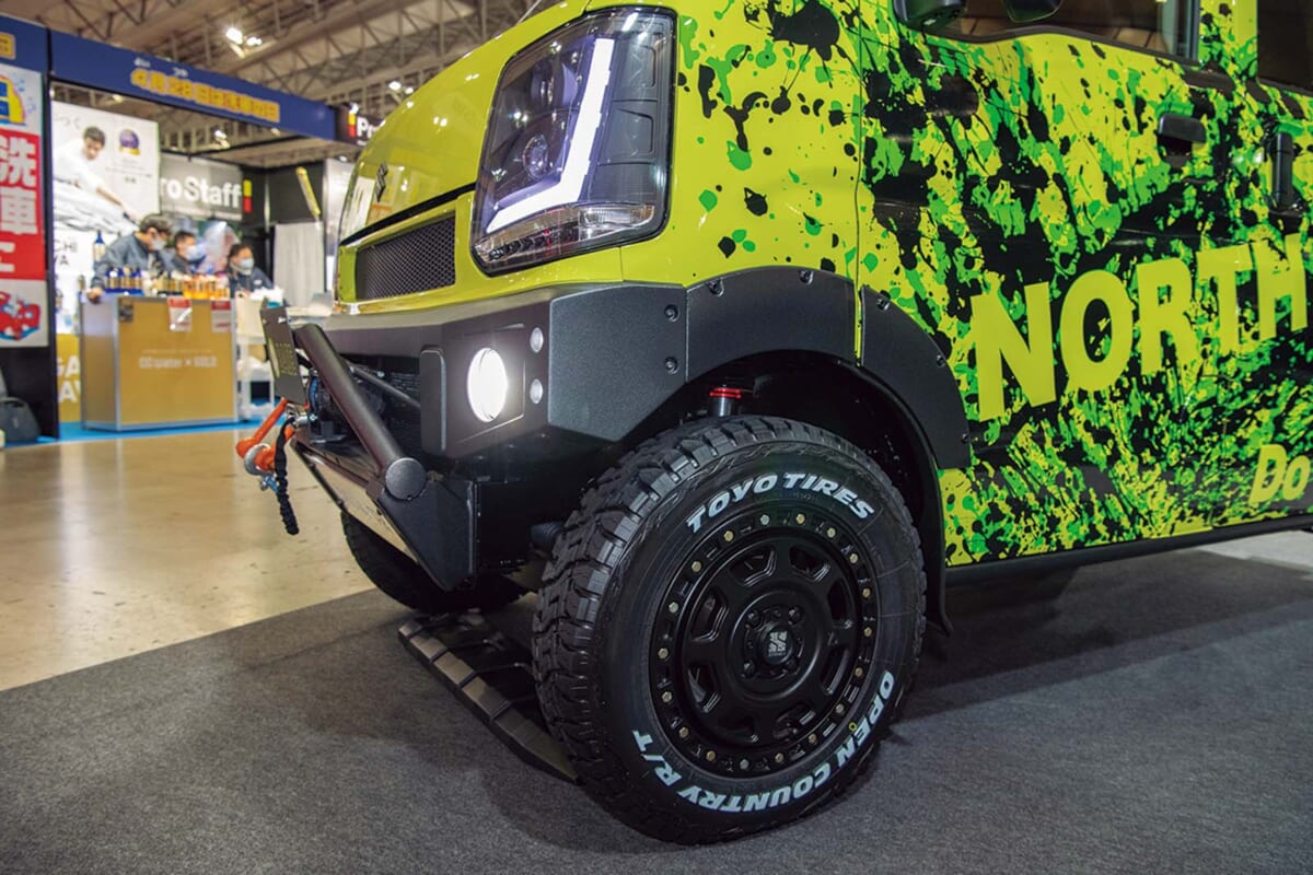 蛍光色をベースとした黄色“ノース・イエロー”を採用。雪道の走行にも耐える、強度を高めた前後のFRPバンパーを採用するなど、東北地方のショップならではの着眼点が目を引く。ハードカーゴ製のキャリアとラダーを搭載し、ルーフ上も最大限に使える工夫も盛り込まれている。ヘッドライトとLEDフォグランプの輝きで精悍さもアップ。