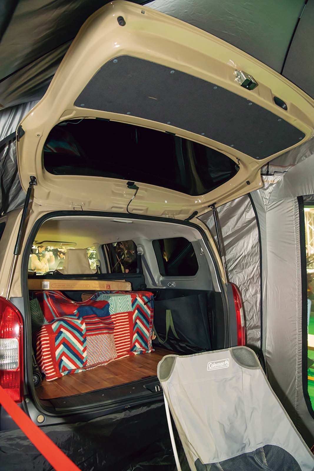 デイキャンプや車中泊の際、クルマの後部に取り付けるだけでマイスペースができあがるテント。通気性が高いものの虫の侵入を防げる3面ファスナー付メッシュスクリーンを備える。収納したときのサイズは直径900mm、厚さ100mmとコンパクトで、約8kgの重さなので手軽に運搬可能。設営もひとりで行えるので、ソロキャンパーにオススメのテントだ。