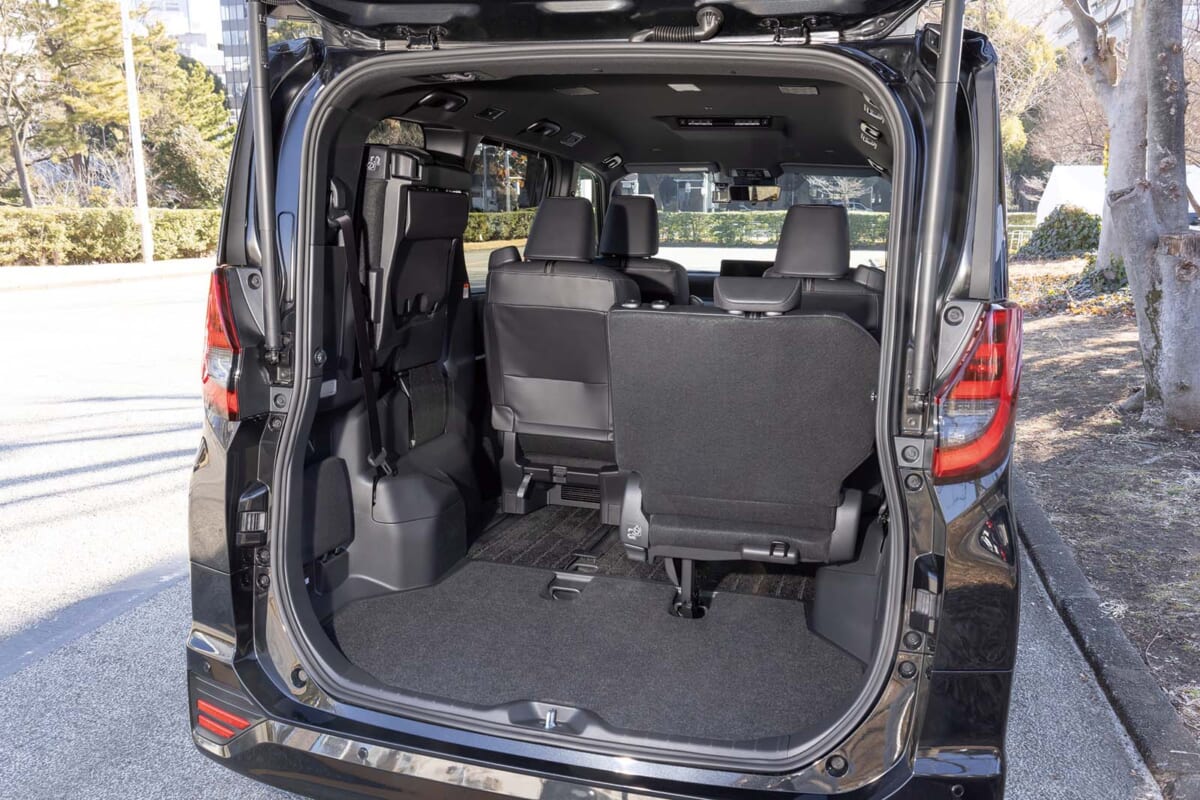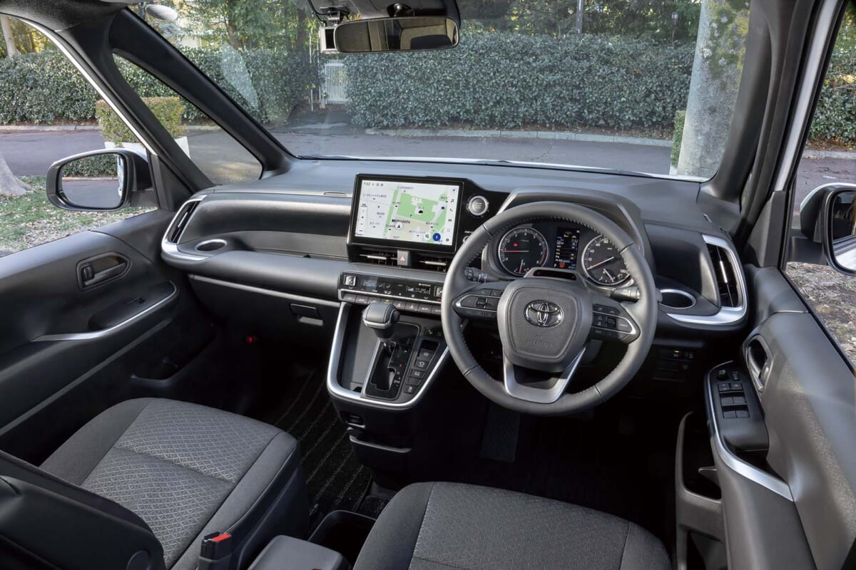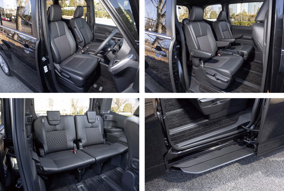 視界の良さが特徴のインパネ回りは運転支援システムや使い勝手もハイレベル。2列目シートは3人掛け仕様も設定された。電動スライドドアの助手席側には機械式サイドステップも装備できる。