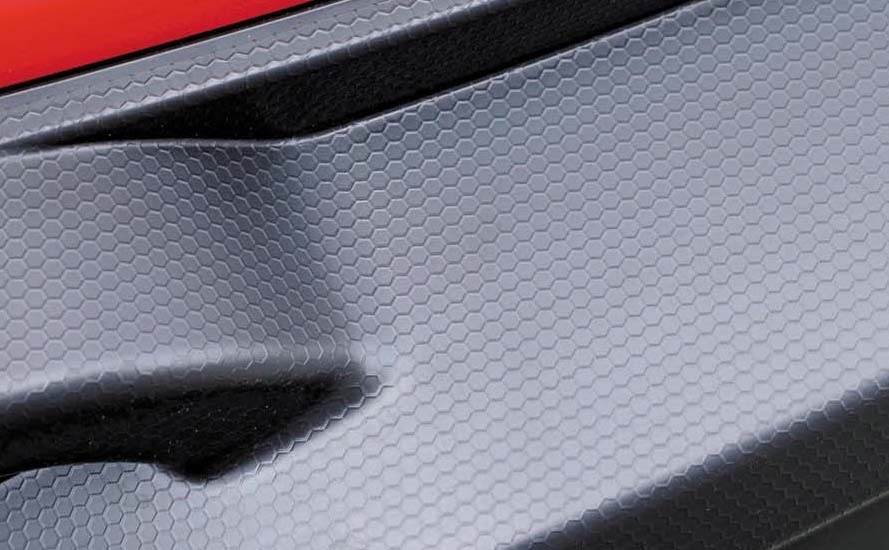 フロントバンパーからボディサイド、リアバンパーまで、黒い樹脂パーツが車体下部を囲むように取り付けられていますが、よく見ると「ヘキサゴン(六角形)」模様になっていて、これが車体表面の空気の流れを整えてくれるそうです。