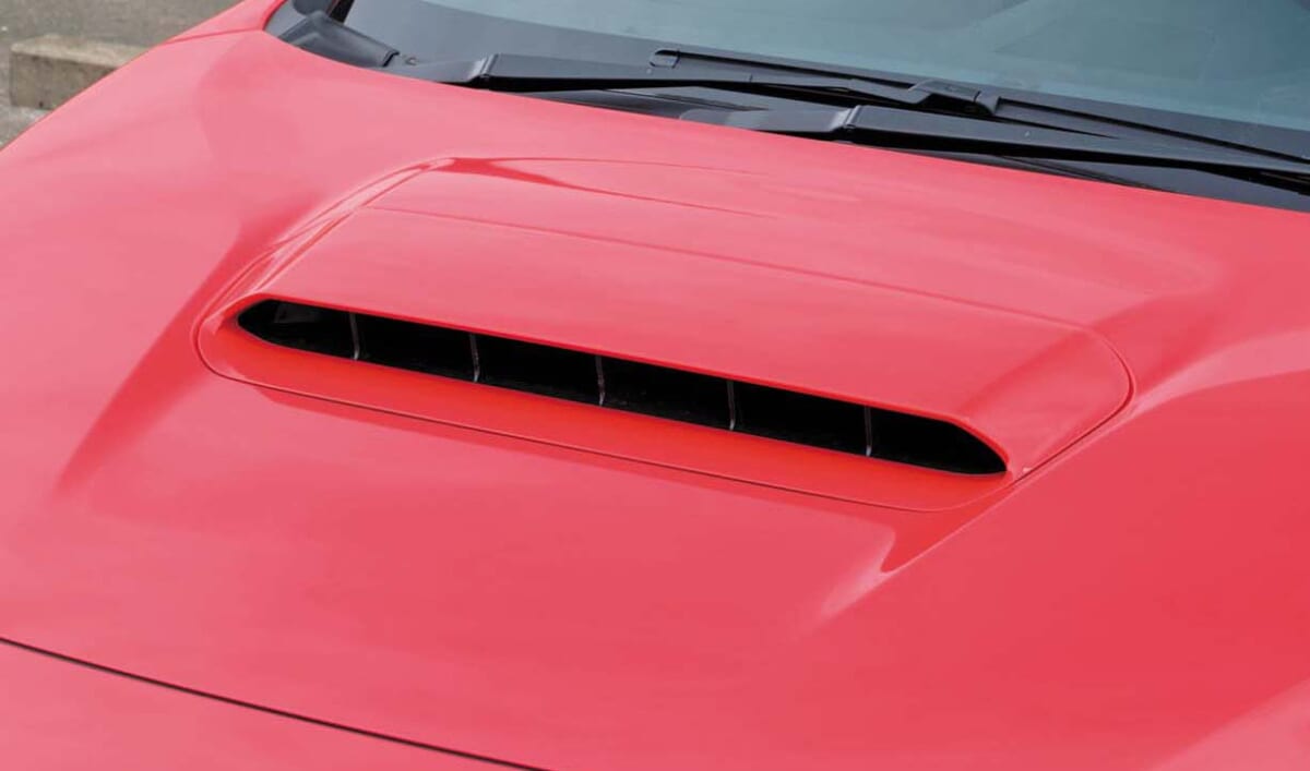 ボンネット上にはエンジンルームへ空気を取り入れるための穴が空いています。これが、鋭い目つきのヘッドライトやSUBARU特有の「ヘキサゴングリル」などと相まって、スポーティでアグレッシブなキャラクターを際立たせています。