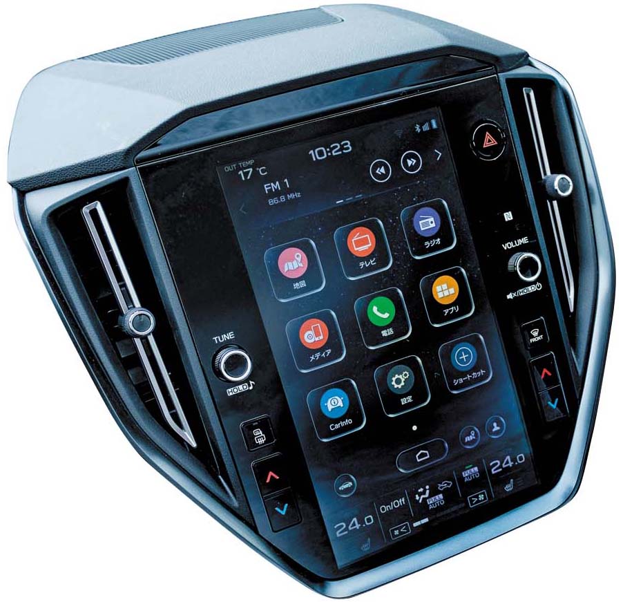 インパネデザインは車体を共有化する「レヴォーグ」と基本的に同形状で、11.6インチの大型センターディスプレイが採用されています。カーナビ、車両情報、エンタメ、エアコンなど各種設定を、タブレットのようにタッチして操作できます。
