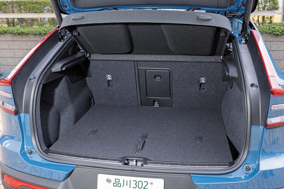 C40リチャージは、日本向けのボルボでは初となるピュアEV。ベースはコンパクトSUVのXC40だが、その外観はグラスエリアをコンパクトにまとめ、クーペとSUVのクロスオーバーモデルに仕立てられている。とはいえ室内や荷室回りの空間はSUVとしても十分に通用する広さを確保。車内を明るく演出するサンルーフが装備されることもあって、大人が後席に座る場合でも狭いと感じるようなことはない。