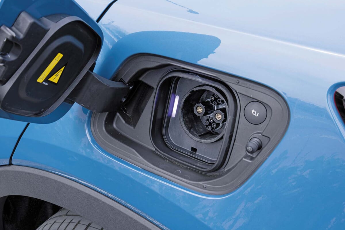 急速充電(写真)、普通充電プラグはボディ左側の2か所。パワートレインは前輪を駆動するシングルモーターと後輪にもモーターが備わるツインの2種類を用意。