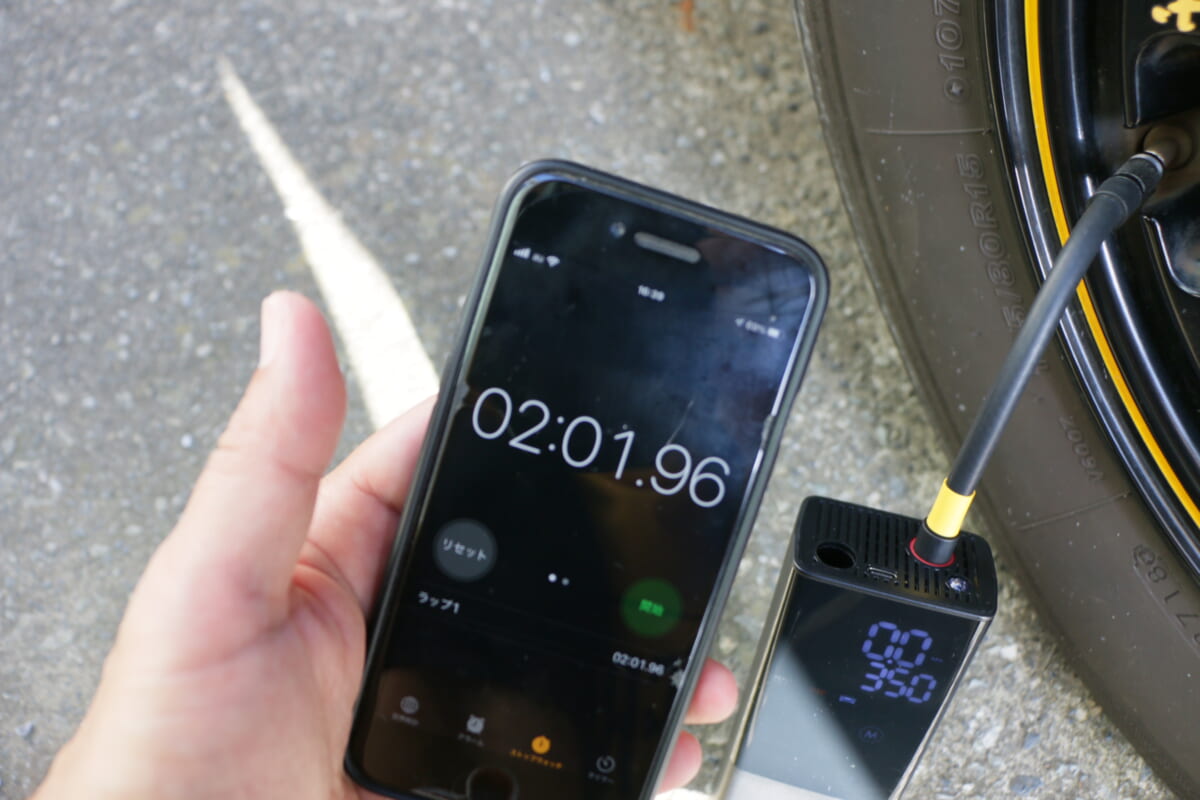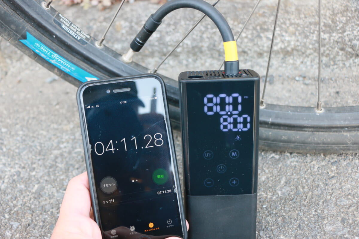 ロードバイク1台、クルマ1台、バイク1台の合計10本のタイヤに空気を入れたところでバッテリー切れ。どのくらい落ちているところから入れるのかにもよりますが、これだけ持ってくれれば十分という印象です。夏の炎天下に、これだけの本数のタイヤに手動のポンプで空気を入れていたら、確実に熱中症で倒れていたでしょう(クルマのタイヤに手動のポンプで空気を入れる人はあまりいないと思いますが……)。