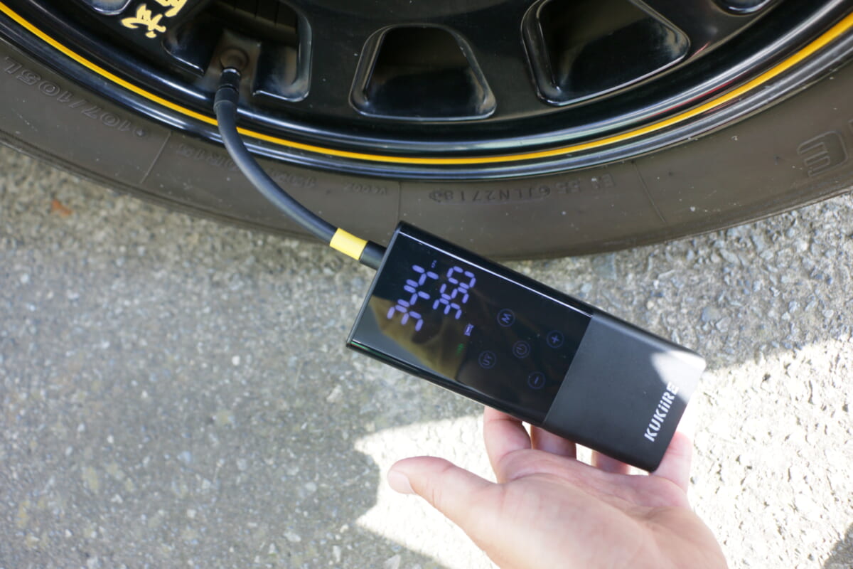 続いては、クルマのタイヤにも空気を入れてみました。空気圧を日常的にチェックしている人は少ないかもしれませんが、ゴムは少しずつですが空気を通すので、1か月で5%程度空気圧が下がると言われています。空気圧が10%程度落ちると、燃費にも悪影響があるので、1〜2か月に1回は空気圧の調整をしておきたいところです。