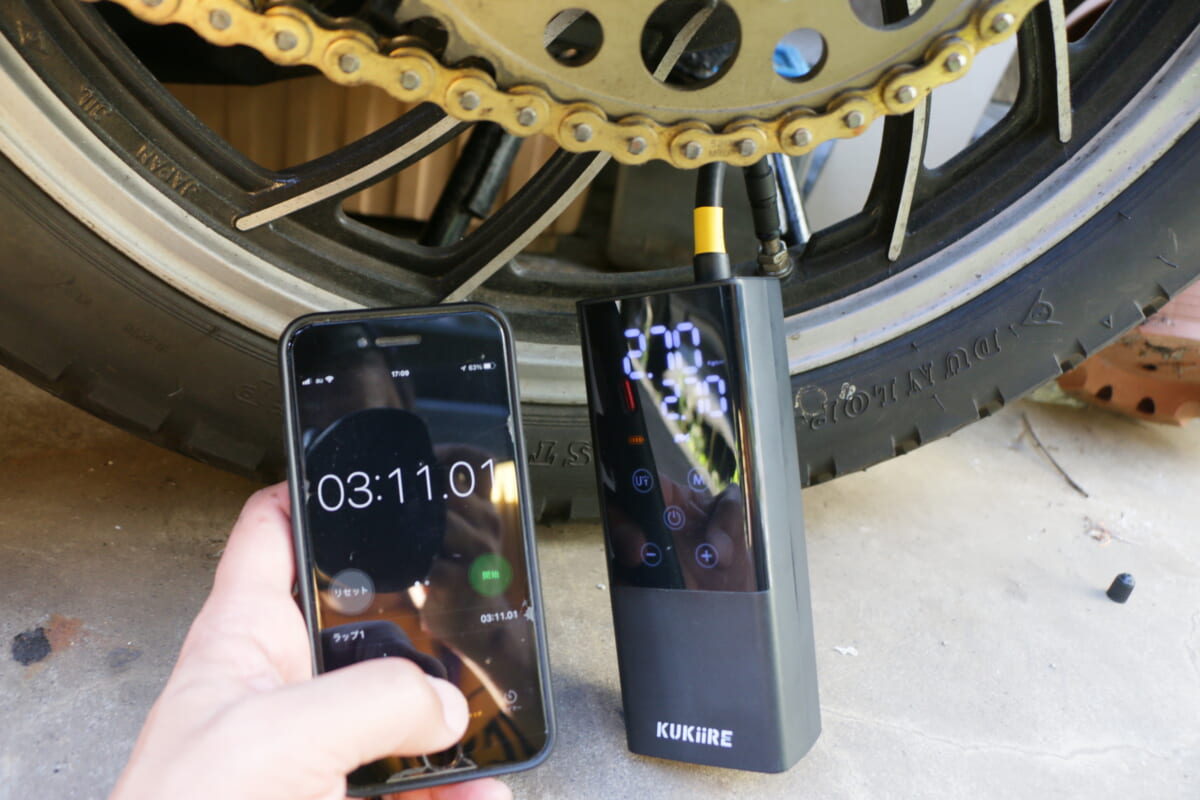 最後にバイクのタイヤでも試してみました。普段、乗る機会が少ないので、乗る前には毎回空気圧を調整する必要があるのですが、今回もやはり既定値をだいぶ下回っていました。バイクの場合、燃費だけでなくハンドリングやブレーキの効きにも影響するので、空気圧の調整は大切です。