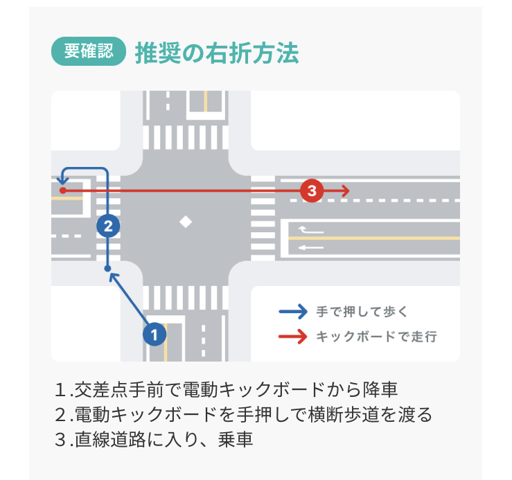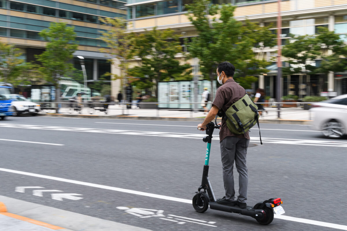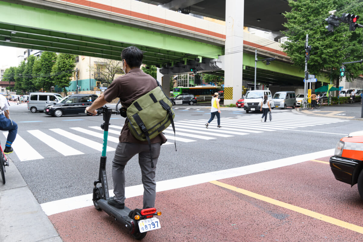 個人的に、最も気をつける必要があるなと感じたのは右折。原付の場合、2車線以上ある道路では2段階右折をする必要がありますが、特定小型原動機付自転車の場合は2段階右折は禁止です。右折レーンがあるような交差点では、クルマと同様に右折レーンから曲がる必要がありますが、15km/hしか出ない乗り物では少なからず危険を感じます。LUUPでも、そうしたシーンでは、キックボードから降りて横断歩道を押して渡り、車列に並ぶ方法を推奨していますが、この走り方が危険が少ないでしょう。