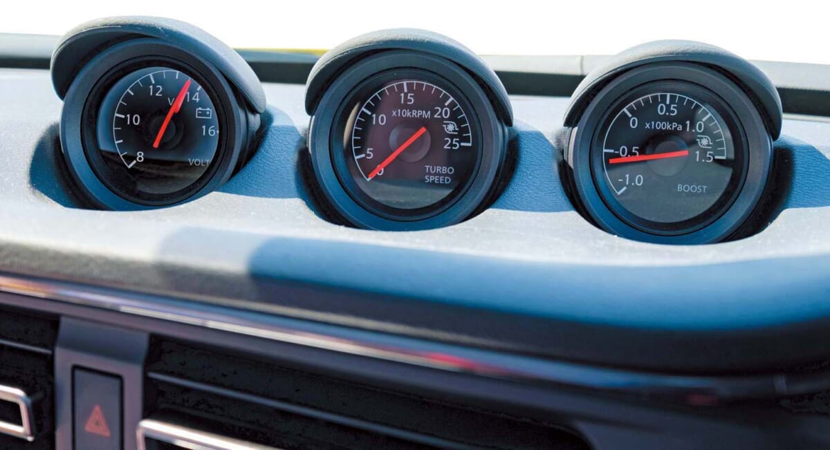初代、2代目など過去モデルで継承されてきた3連メーターが、インパネ中央上部に設置されています。ブースト計、ターボ回転計、電圧計ですが、内容はあまり関係なくて(笑)、ここにメーターが3つ付いていることに価値があります!