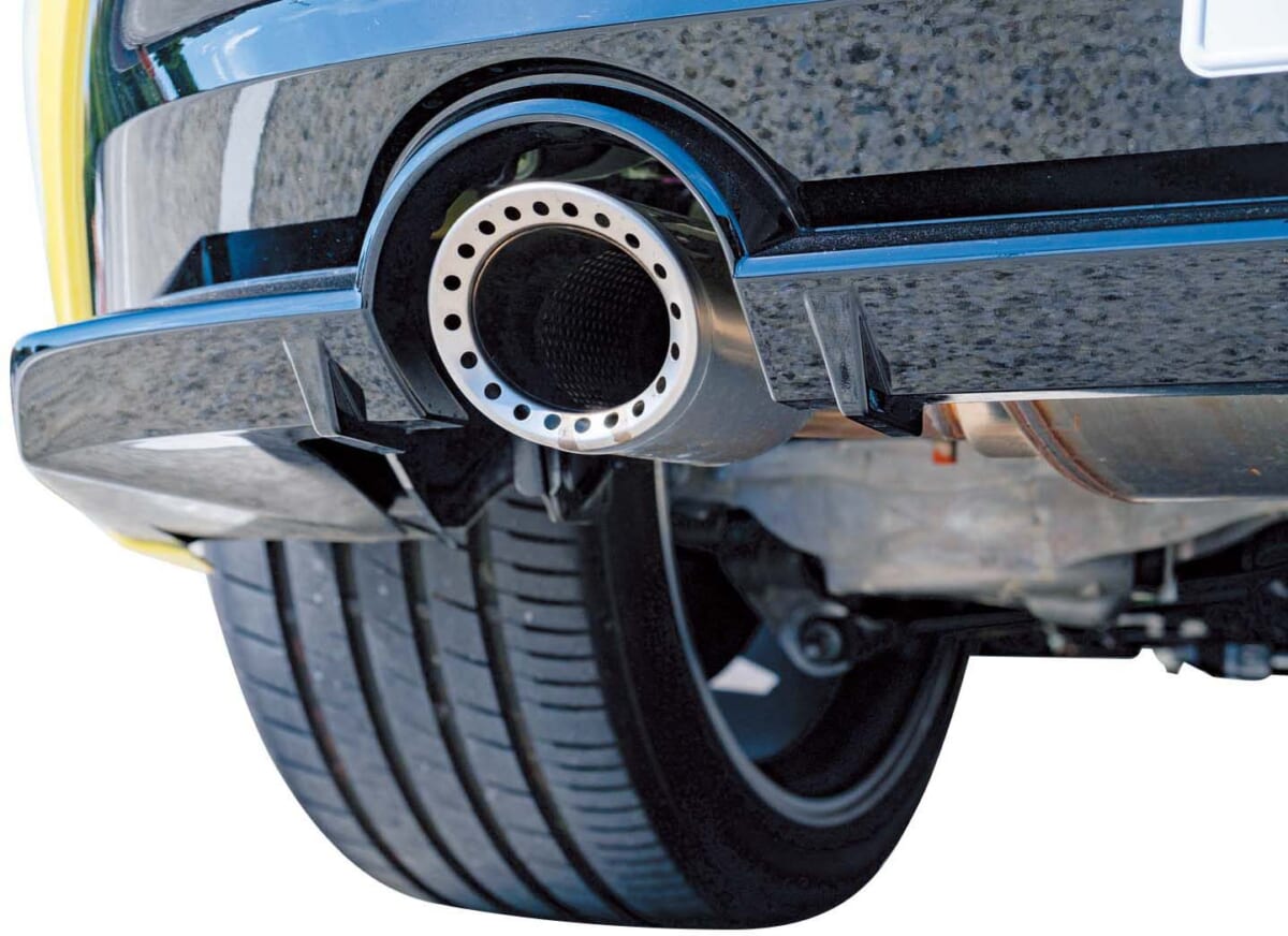 両側2本出しマフラーがスポーティです。しかしよく見ると、排出口の周囲に小さい穴がたくさん開いています。この穴の影響かどうかわかりませんが、排気音はとても静かで、見た目ほどスポーティではありません。