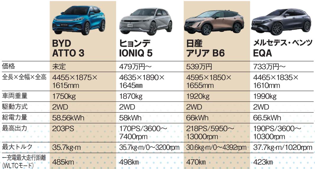 価格はいずれもEV購入補助金適用前のもの。総電力量は60kWh近辺、カタログ値ではあるが一充電最大走行距離は500km近くにまで達する。ATTO 3、IONIQ 5ともにスペック的には日本や欧州のEVと肩を並べていることがわかる。