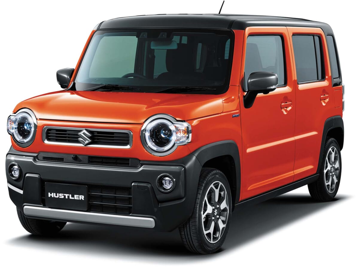 ジムニーは3ドアだが、ハスラーは5ドアなので実用性が高い。ジムニーはボディの角が角ばっているが、ハスラーは適度に丸みを帯びている。そして丸目の外側に目尻を付けたハスラーの顔は、ジムニーに比べるとグッとソフトで、ぬいぐるみっぽく感じられる。