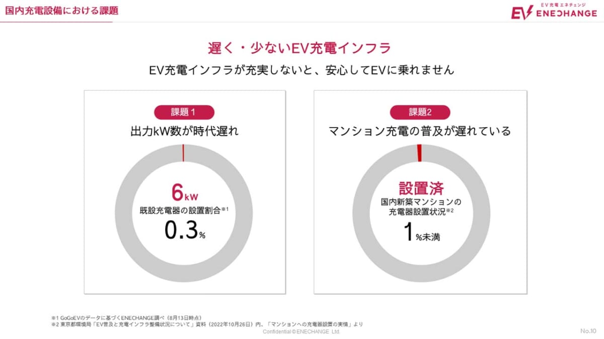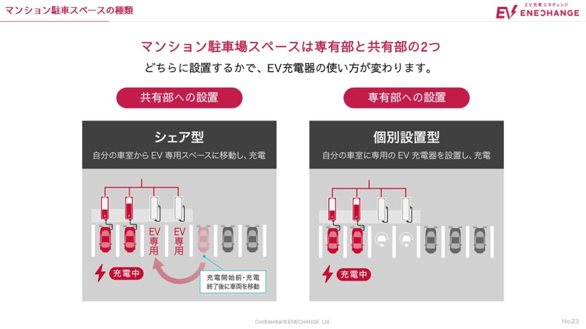 この日の発表会で明らかにされたのは、エネチェンジがマンション充電サービスへ新規参入すること。これまで、駐車スペースが共同管理となっているのがほとんどのマンションでは、居住者それぞれの立場の違いからEV用充電システムの導入が思うように進まないという事情を抱えていました。そんな中でエネチェンジは、マンションでの導入拡大に向けて、2つのプランを発表したのです。