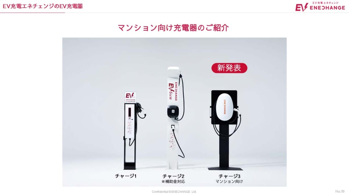 さらに設置する充電設備も、既に発売されていたスタンド型の『チャージ1』『チャージ2』に加え、新たに壁掛けに対応した『チャージ3』を追加してラインナップも拡充しています。エネチェンジによれば、「3製品とも充電機能は同じで、設置場所に応じて最適なものを選んでほしい」とのことでした。