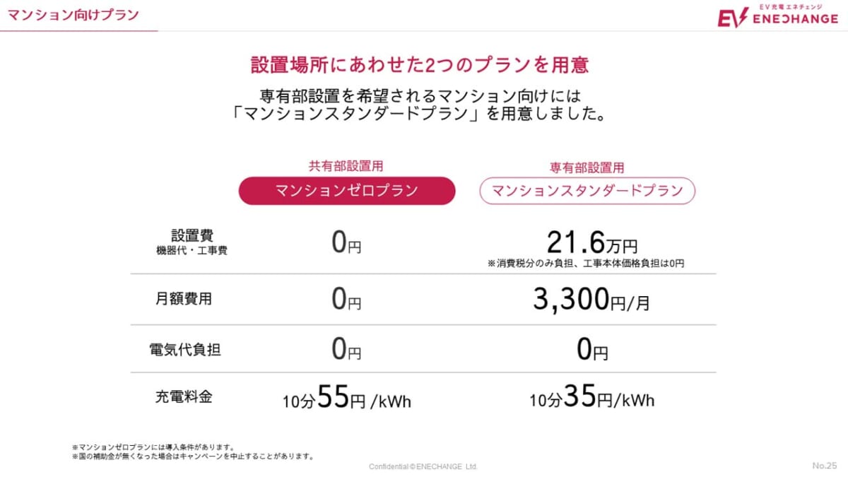 「マンションスタンダードプラン」では、専有部への設置ということもあって費用負担が発生します。エネチェンジによれば、設置費は21万6000円(機器代、工事費込)で月額費用は3300円/月と設定。電気代の負担は0円ですが、充電料金は10分35円/kWhと割安に設定しているのが特徴となります。
