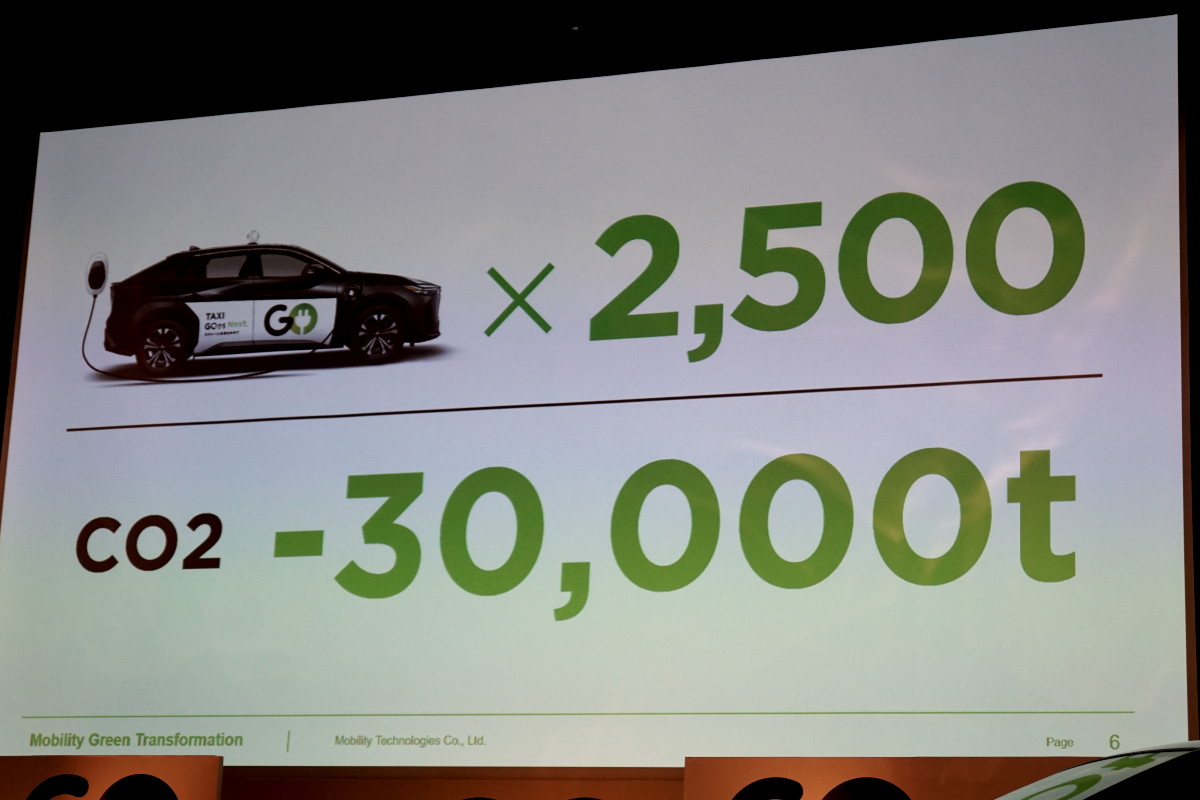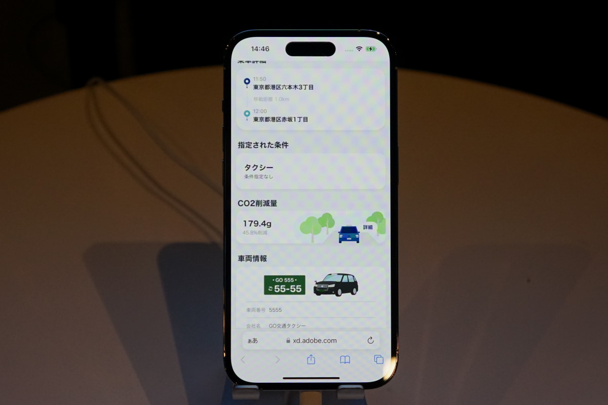 また、スマホアプリ「GO」のアップデートにより、利用したタクシーの走行距離からCO2排出削減量を算出し見える化することで、利用者にEV車種の積極的な利用を促進させる取り組みも実施予定(アップデート時期は未定。法人向けサービス「GO BUSINESS」では実装済み)。将来的にはアプリからEVタクシーを選択して配車するような機能も実装したいとしています。