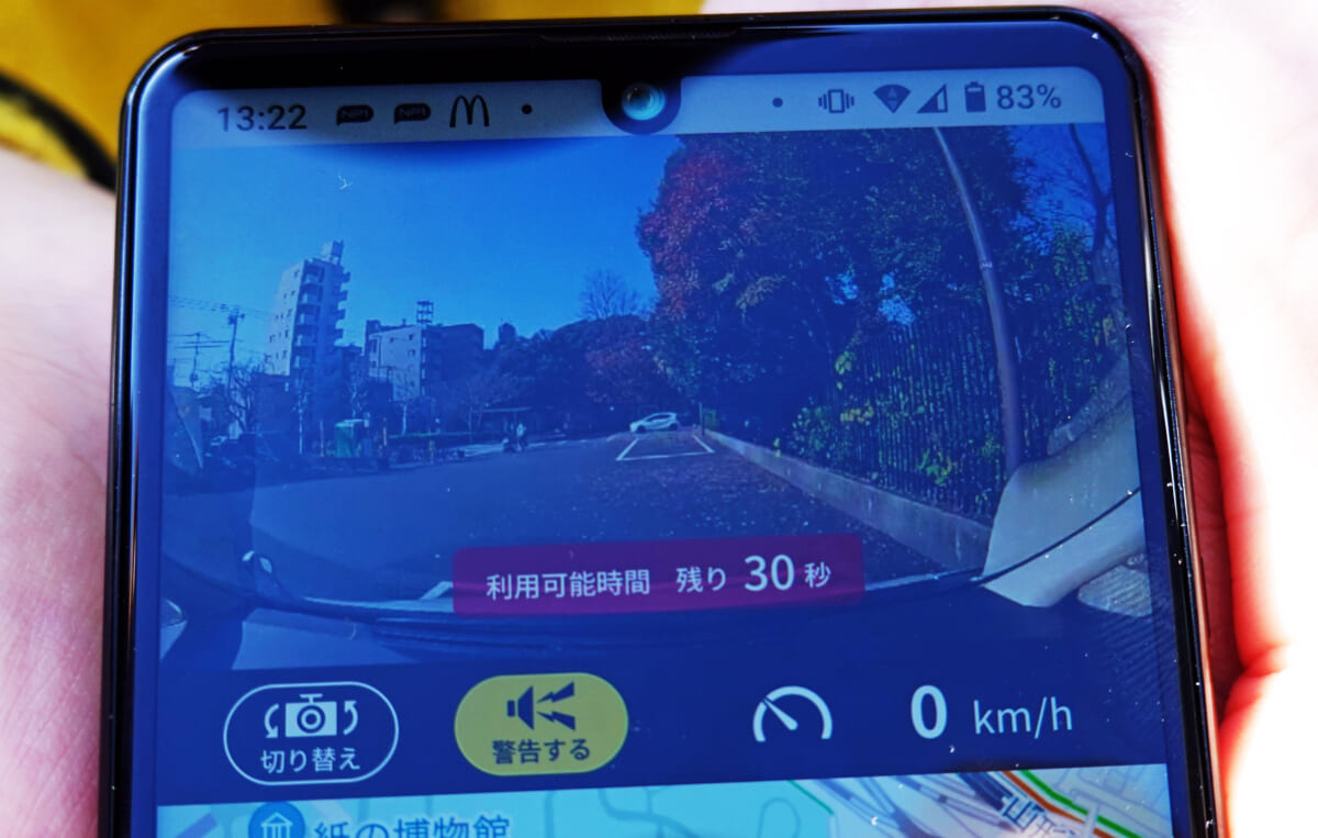 そして、ここからが「マイカーウォッチ」機能の真骨頂です。アプリ上で黄色で表示されている「警告する」アイコンをタップすると、即座に音声で車内に「カメラ作動中。異常状態を確認し、通報しました。遠隔監視を行っています」と警告。これが最大5分間にわたって繰り返されるのです(利用は1回5分で、月に計60分まで)。