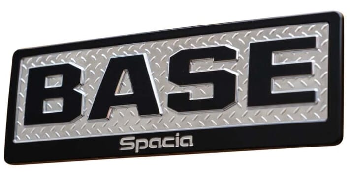 リアの「BASE(ベース)」と車名が書かれたエンブレムをよく見ると、文字周囲のシルバーの部分に、まるで工事現場の足場に使う鉄板のような滑り止めっぽい加工が施されています。まさに仕事場! 細かいところにまでこだわっていますね。