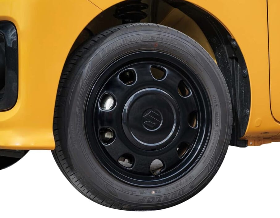 クルマのホイールといえばシルバーの印象が強いですが、このスペーシア ベースのホイールは真っ黒。カスタマイズの基本とも言えるホイール塗装が最初からされているので、いきなり玄人っぽい雰囲気を醸し出せます。
