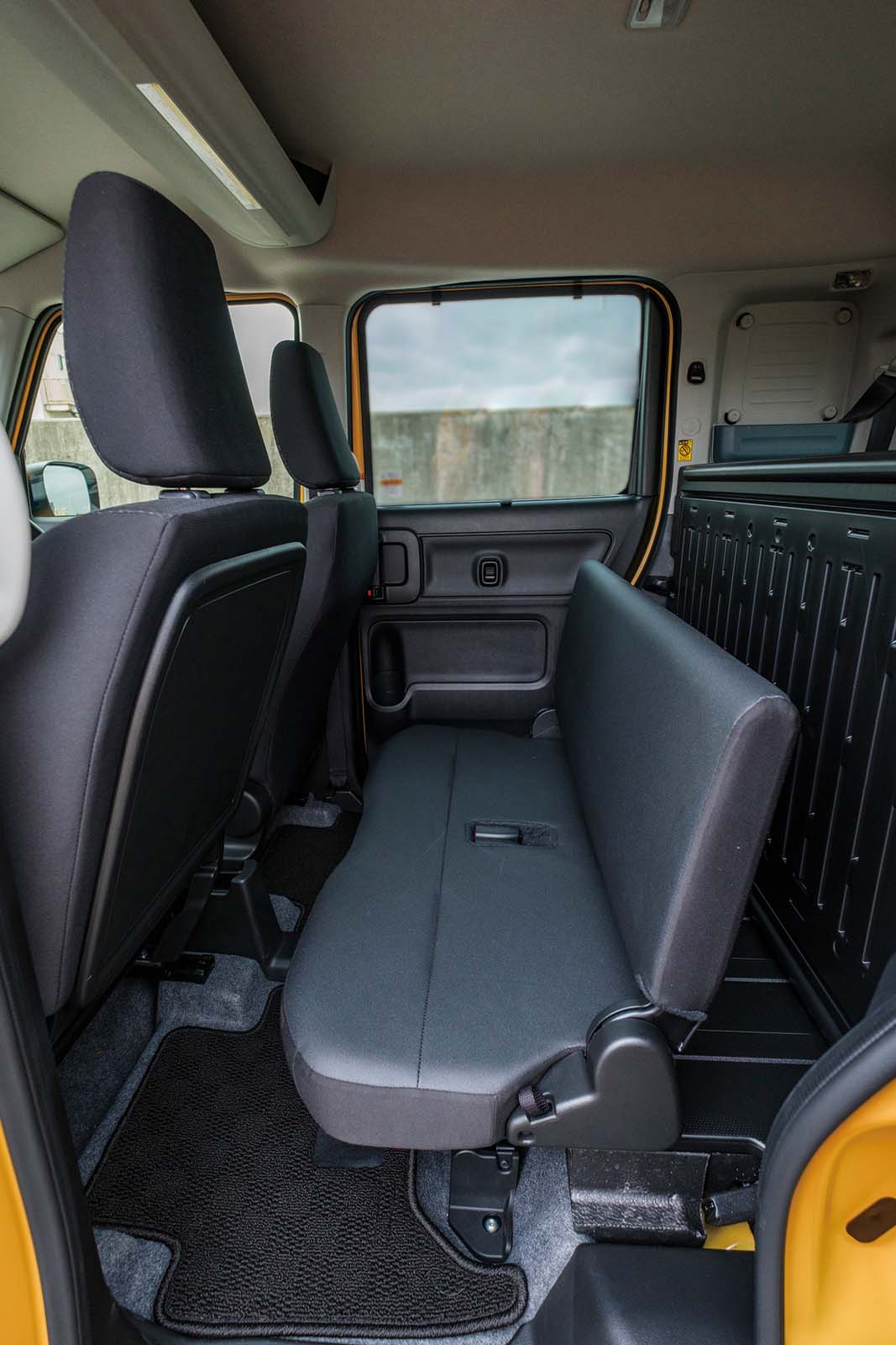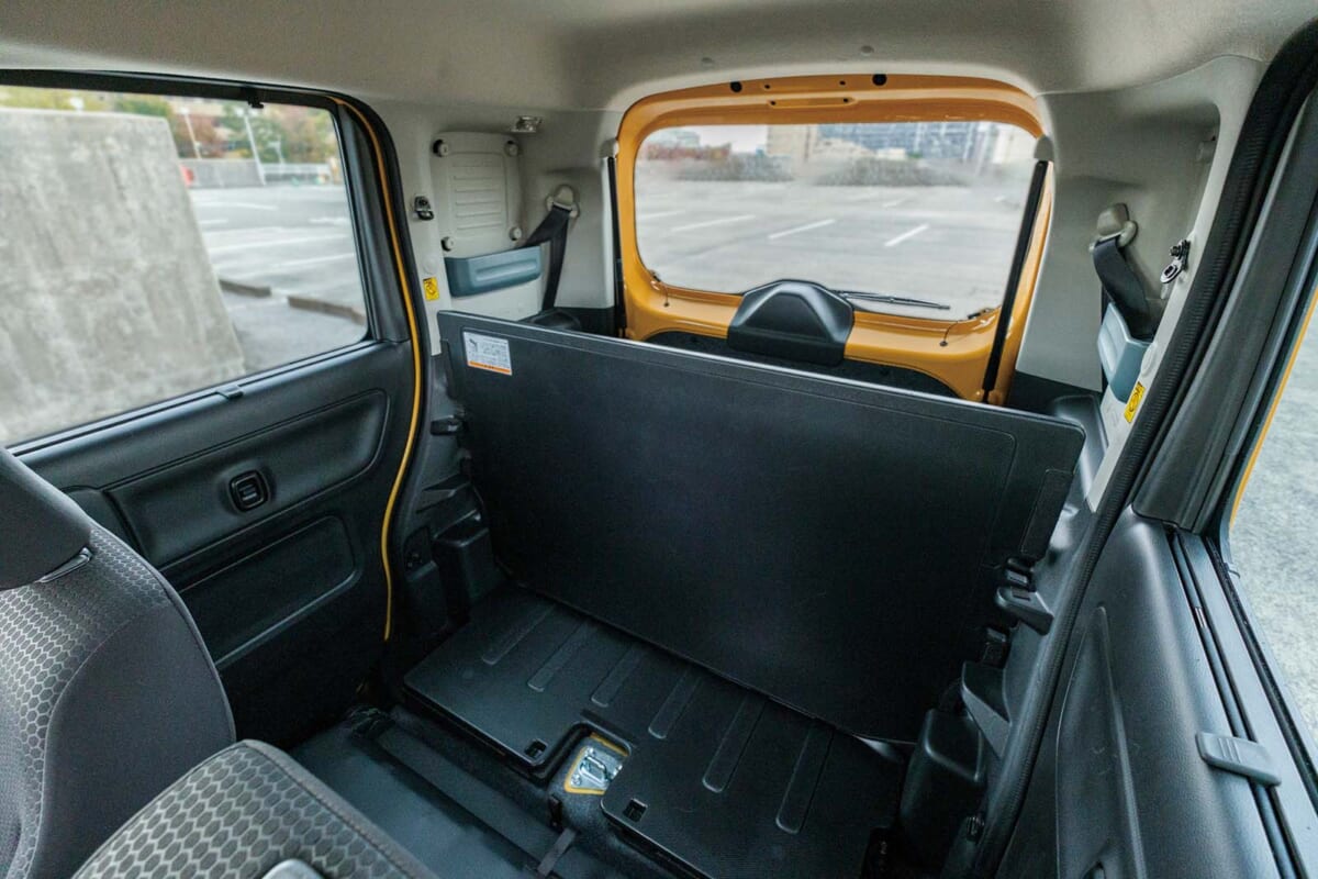 非常に小さなリアシートがついています。このクルマは商用車(4ナンバー貨物)なので、貨物スペース優先で設計されているため、リアシートは取って付けたような必要最低限のものになっています。かわいいですが快適性は期待できません。