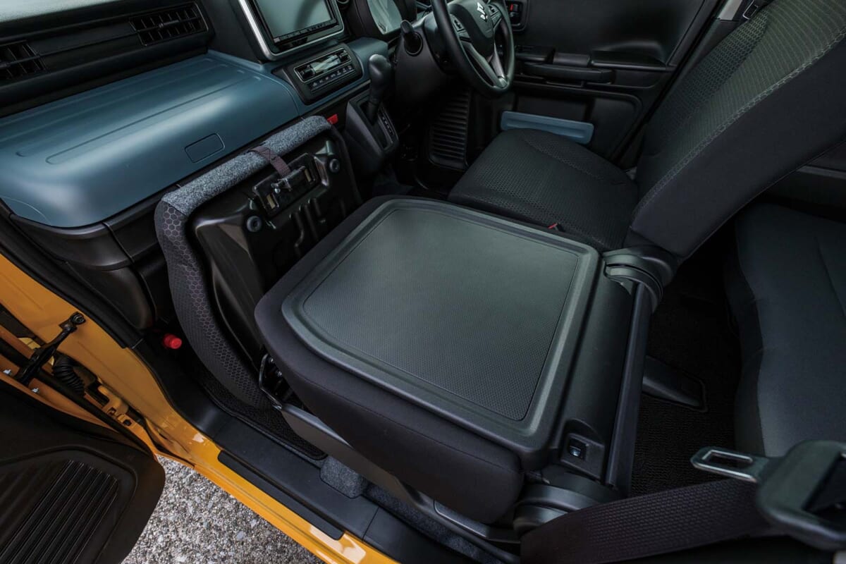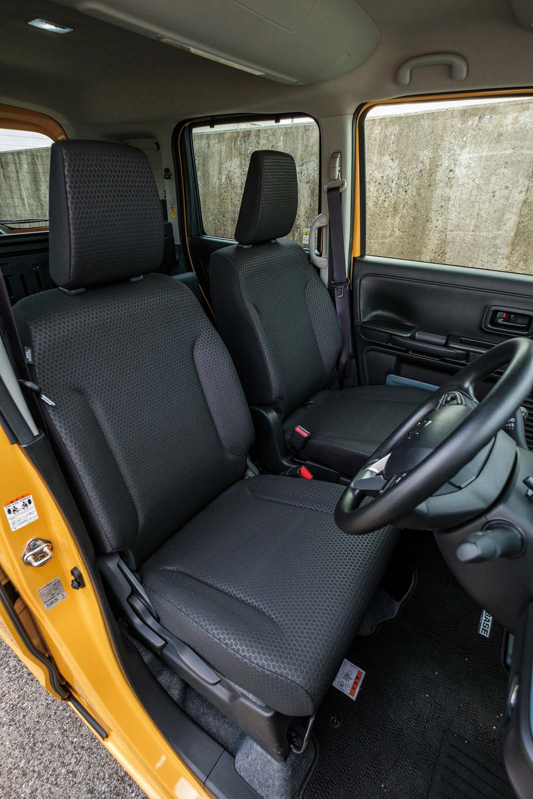 スペーシアやスペーシア カスタムのオーナーならすぐに気付くと思いますが、このべースではフロントシートがベンチタイプではなく、左右セパレートタイプになっています。車内を前後方向に移動できる、“秘密基地”らしいつくりです。
