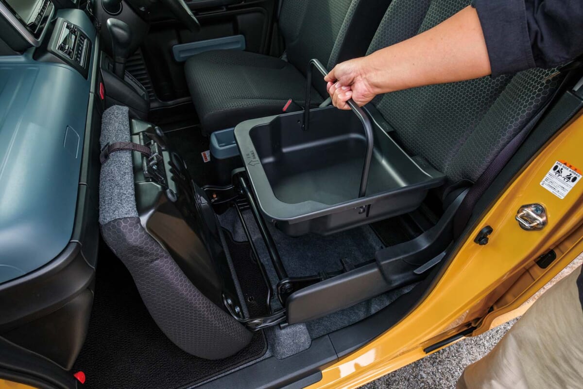 当然のごとく、助手席も道具として使えます。背もたれを前方に倒せばテーブルに(下)。キズが目立ちにくい加工が施されているのもポイントが高いです。座面を外せば、買い物カゴのように持ち運べるアンダーボックスが出現します(上)。