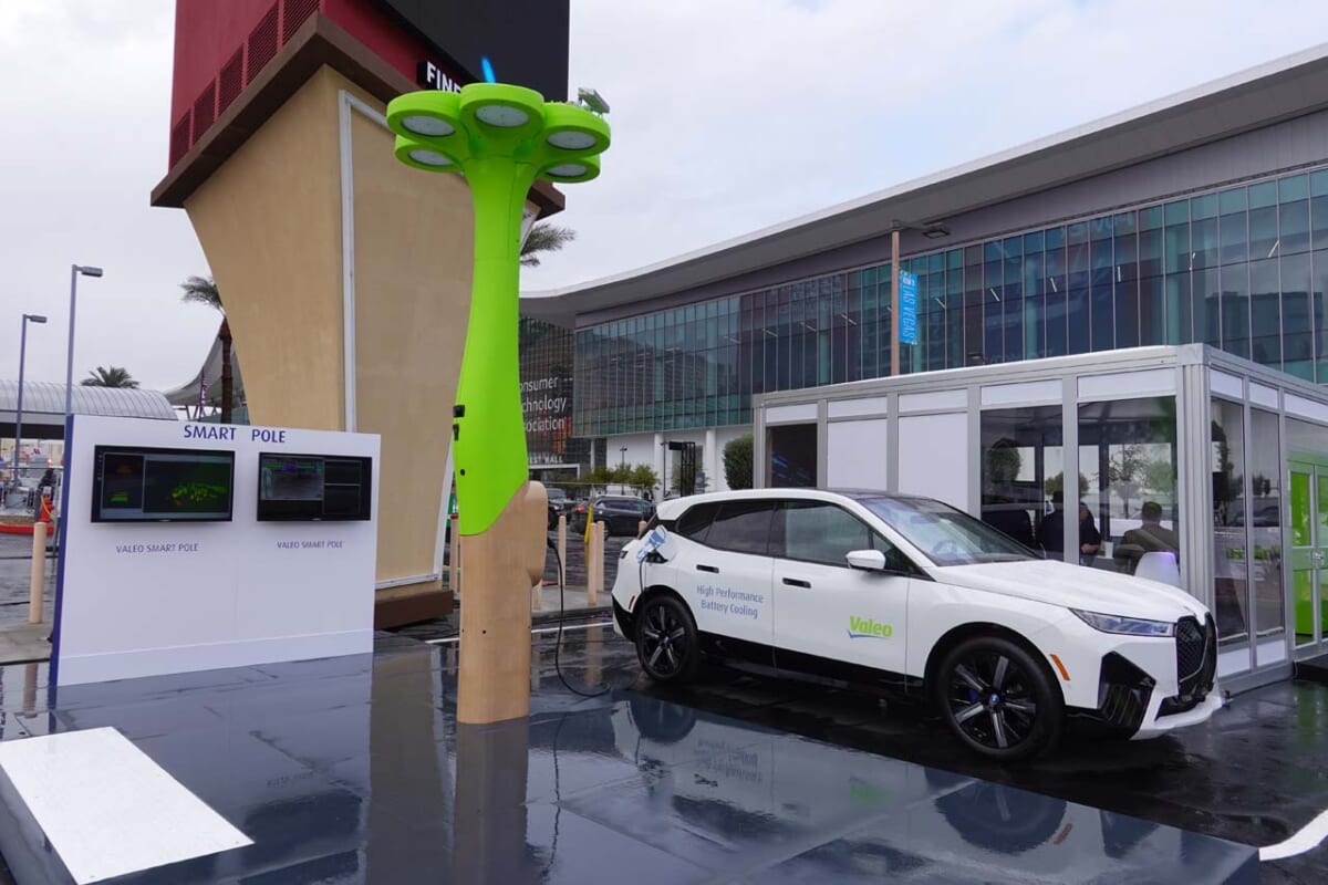 フランスのサプライヤー「ヴァレオ」が出展したのは、歩行者への利便性やEV用充電器としても活用できる『スマートポール』です。ポール下部に埋め込まれた超音波センサー(ソナー)で歩行者の位置を把握しながらトップに備えられた円形のLED照明が必要な位置を照らします。さらに、光学カメラやサーマルカメラ、レーザースキャナ「SCALA LiDAR」により、歩行者の位置に応じて信号を切り替えたり、歩行者が道路へ飛び出さないような警告を出すこともできるそうです。