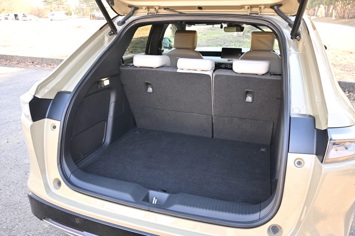 ウエストラインが高いがゆえ、室内スペースは狭そうにも見えるが、さにあらず。「フィット」譲りのセンタータンクレイアウトによって、車内には余裕が感じられる。また、リアシートは座面を跳ね上げてからシートバックを前方へ倒すことができるので、ラゲッジルームを拡張した際の床面がしっかりフラットになる。こういったところはSUVを趣味の道具として使う人にとって重要なポイントだ。