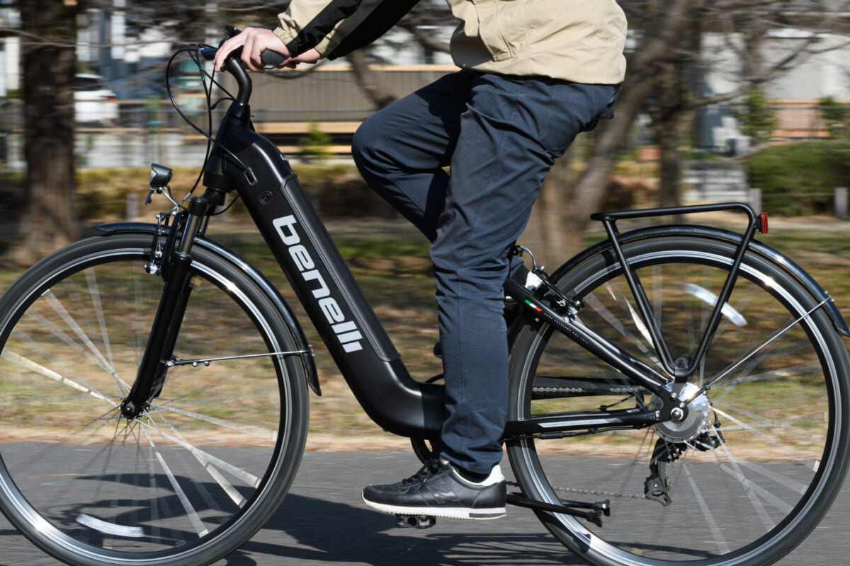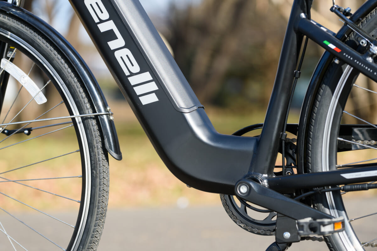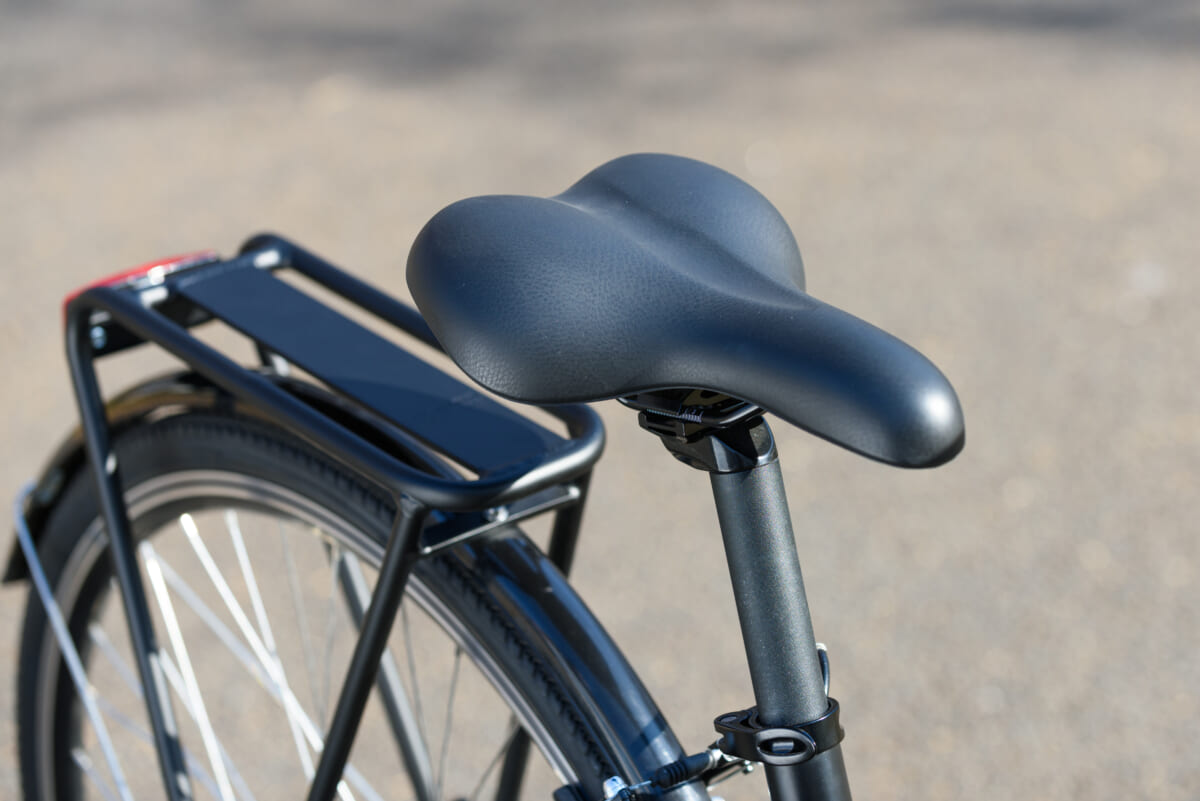 フレームの形状はステップインタイプで、フェンダーやキャリアなどの装備も使い勝手を重視した作りですが、乗り味はスポーツタイプのe-Bikeに近いフィーリング。その印象に効いているのが、サドルの真下にペダルが位置するようなフレーム設計です。スポーツタイプの自転車では一般的な設計ですが、この配置だとペダルを漕ぐ際に太腿の裏側やお尻の筋肉が使えるので、長時間乗っても疲れにくいというメリットがあります。