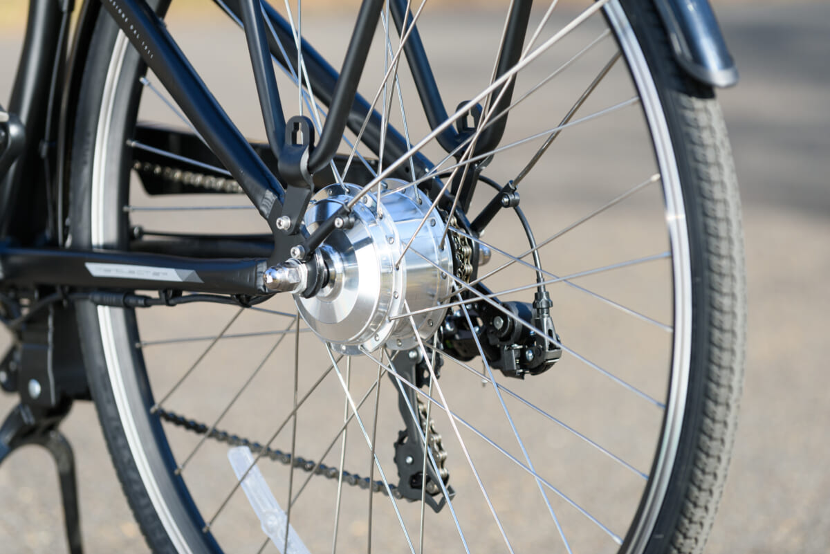 e-Bikeの心臓部であるドライブユニットはAKM製のハブモータータイプを採用。後輪の軸(ハブ)とモーターが一体となっているので、車体の中央に搭載するタイプのドライブユニットと違って目立たないので、電動アシストであることがわかりにくくなっています。バッテリーもフレームに内蔵されるタイプとなっているので、こちらも自転車のデザインを邪魔しないスッキリとした見た目です。