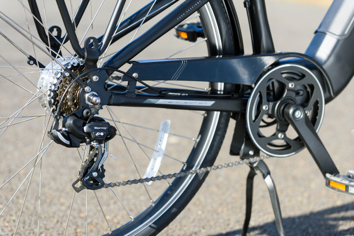 変速機構はシマノ製の「TOUNEY(ターニー)」グレードの7段。チェーンカバーが装着されているので、ズボンの裾などをチェーンに巻き込んでしまう心配がありません。