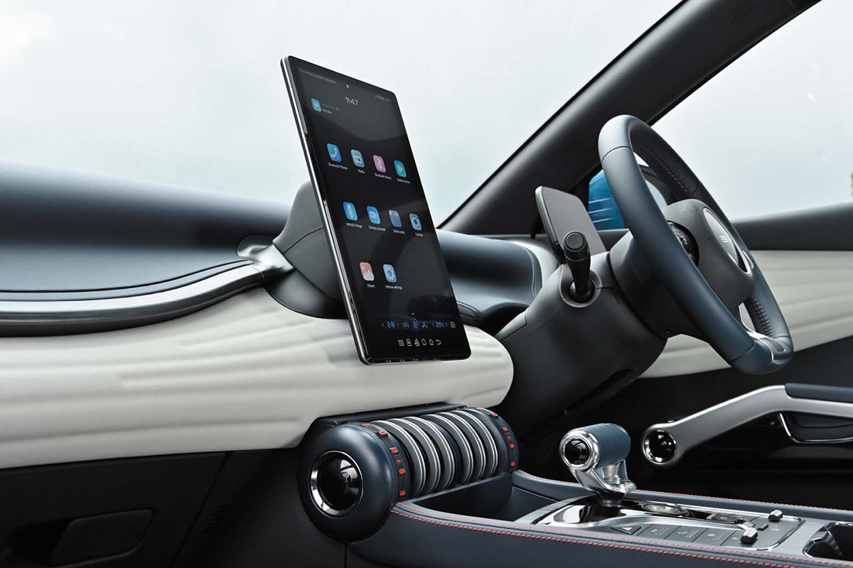 一方、インテリアには随所に斬新な手法が取り入れられているのが興味深い。インパネ中央にあるタブレット風ディスプレイは縦横どちらでも使えるようになっているほか、ドアポケットの伸縮性コードでは音が奏でられるなど、その発想には既存メーカーにはない独自の持ち味がある。