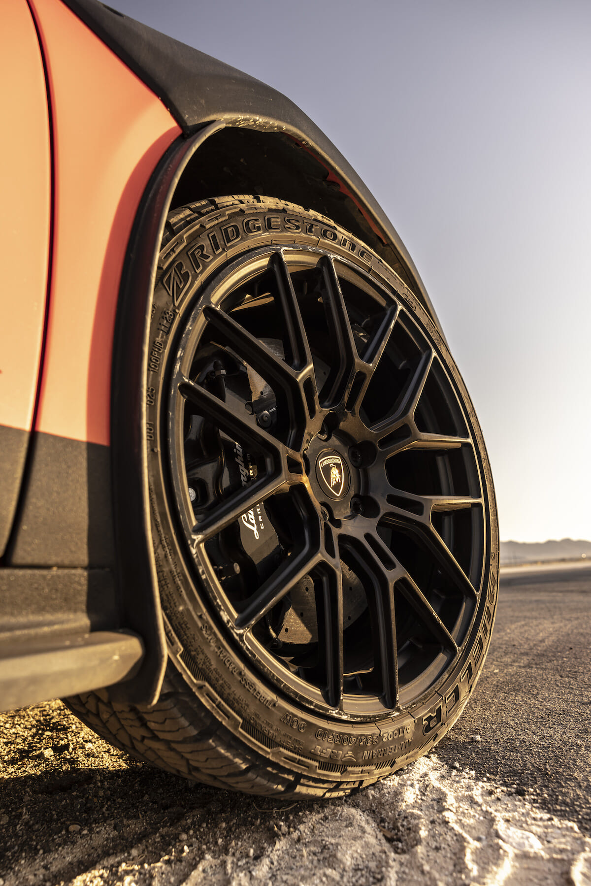 SUV専用のブランドですが、今回、ランボルギーニとのコラボで開発されたステラ―ト専用タイヤ。乾燥路面はもちろん、ダートも泥の路面でも、浅い雪の路面もどんとこい!ブロックが大きくかなりマッスル。ちなみにサイズはフロントが235/40 R19、リアが285/40 R19。
