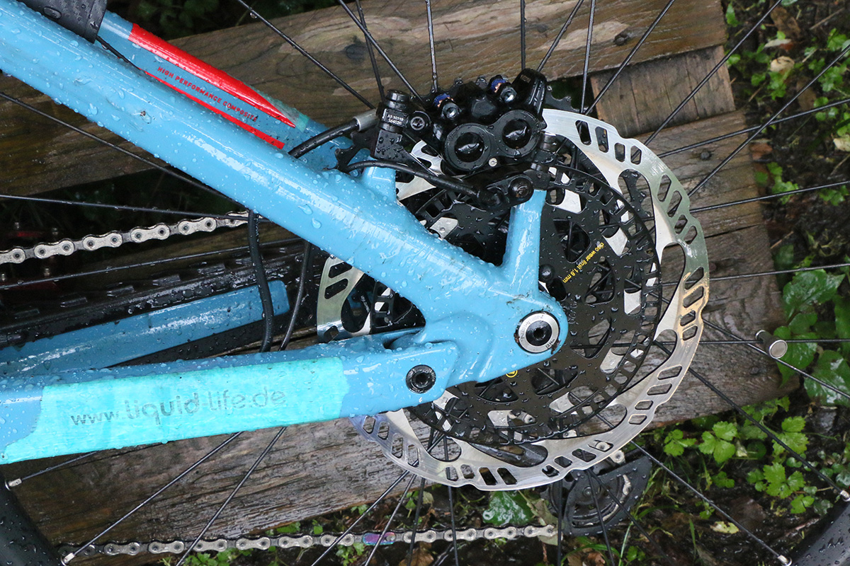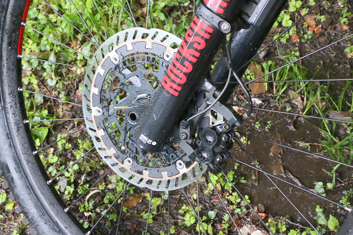 試乗用e-MTBをよく見ると、リアブレーキにも回転センサーが取り付けられています。ただ、ABSが効くのはフロントのみで、リアはフロントとの回転差を検知するためのものだとか。MTBで山道を下る場合、フロントブレーキを掛け過ぎるとリアタイヤが持ち上がって前転してしまうこともありますが、リアが持ち上がってロックすると自動的にフロント側のABSが作動する仕組み。”握りゴケ”と呼ばれるフロントロックによる転倒も、前転も防いでくれる優秀な機構です。
