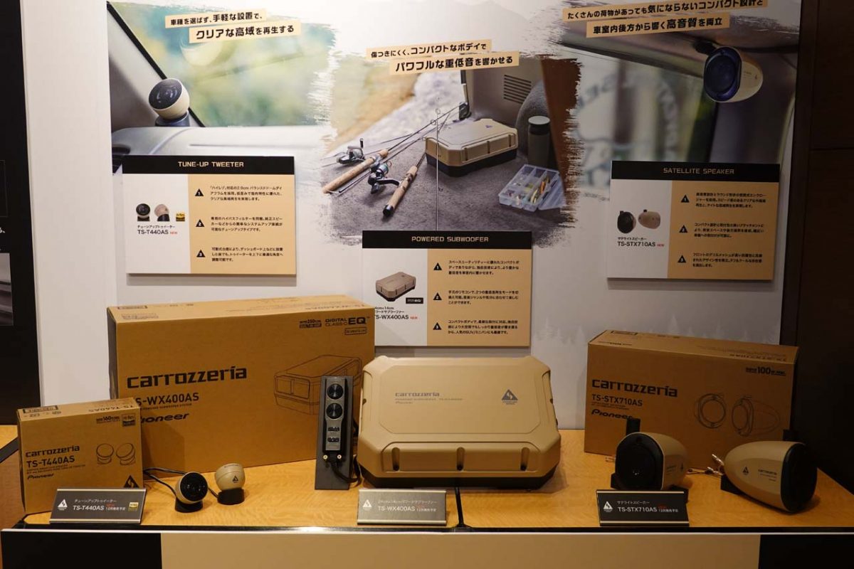 2023年秋モデルではオーディオ系の新モデルも数多く投入されました。なかでも目を引いたのが、アウトドアレジャーをライフスタイルとして楽しむ人たちに向けた「アドベンチャーシリーズ」です。パワードサブウーファーやツィーター、サテライトスピーカーの3つで、いずれもアースカラーとなるライトベージュカラーを採用し、どんなクルマにもマッチしそうな雰囲気を出しています。また、荷物の積み下ろしなどでも傷つきにくいストーン調塗装を採用するといった、こだわりも見逃せません。