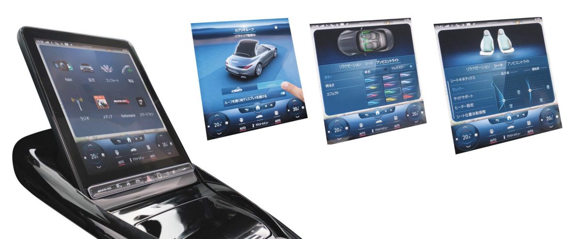 中央のディスプレイはとにかくデカく、設定や操作をほぼこの画面上で行うため、インパネの物理的なスイッチは少なくなっています。屋根の開閉、車内照明、シートの包まれ具合までここで操作します。なお、オープンカーらしく角度も微調整できるようになっています。