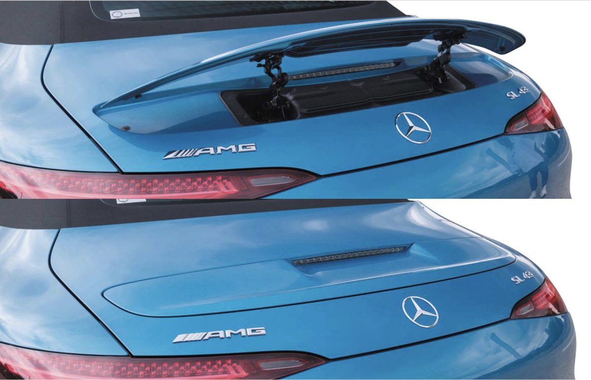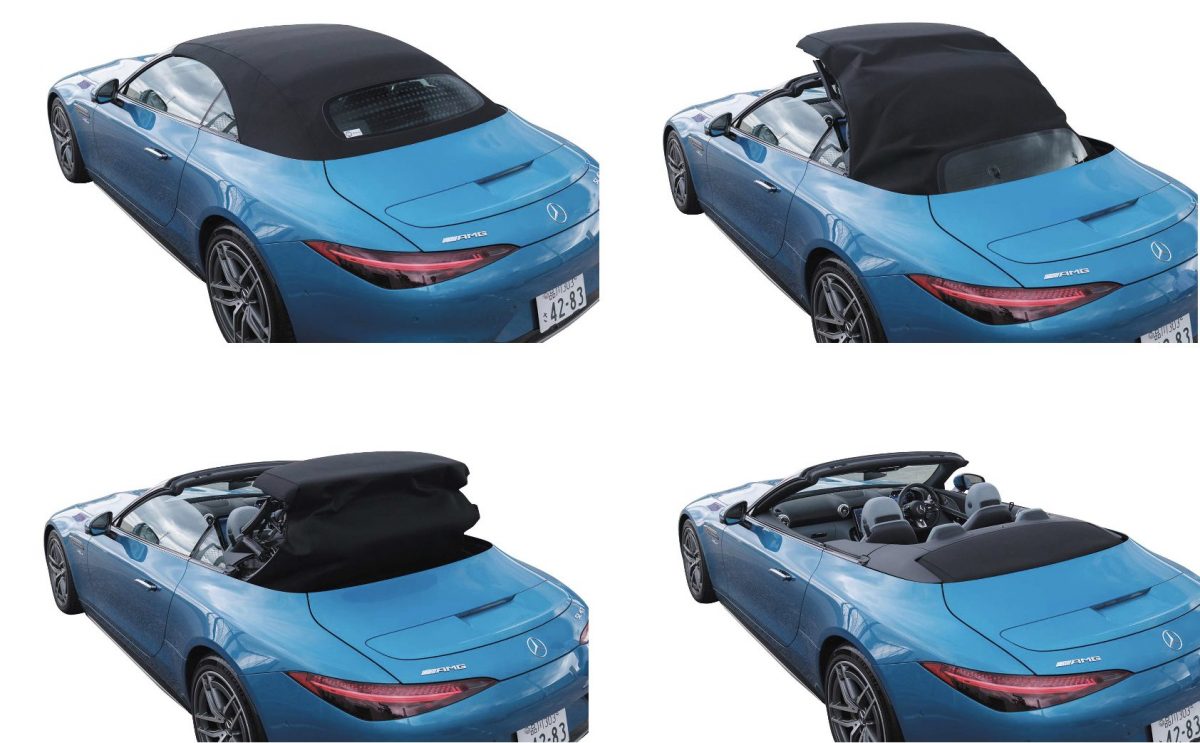 電動式であることは先代から引き継ぎましたが、その素材は幌製へと原点回帰しました。2+2シートなのでちょっと前後に長いのですが、幌がシート後方スペースに畳まれていく開閉動作は、メルセデスらしい精密な動きで、実に美しいです。
