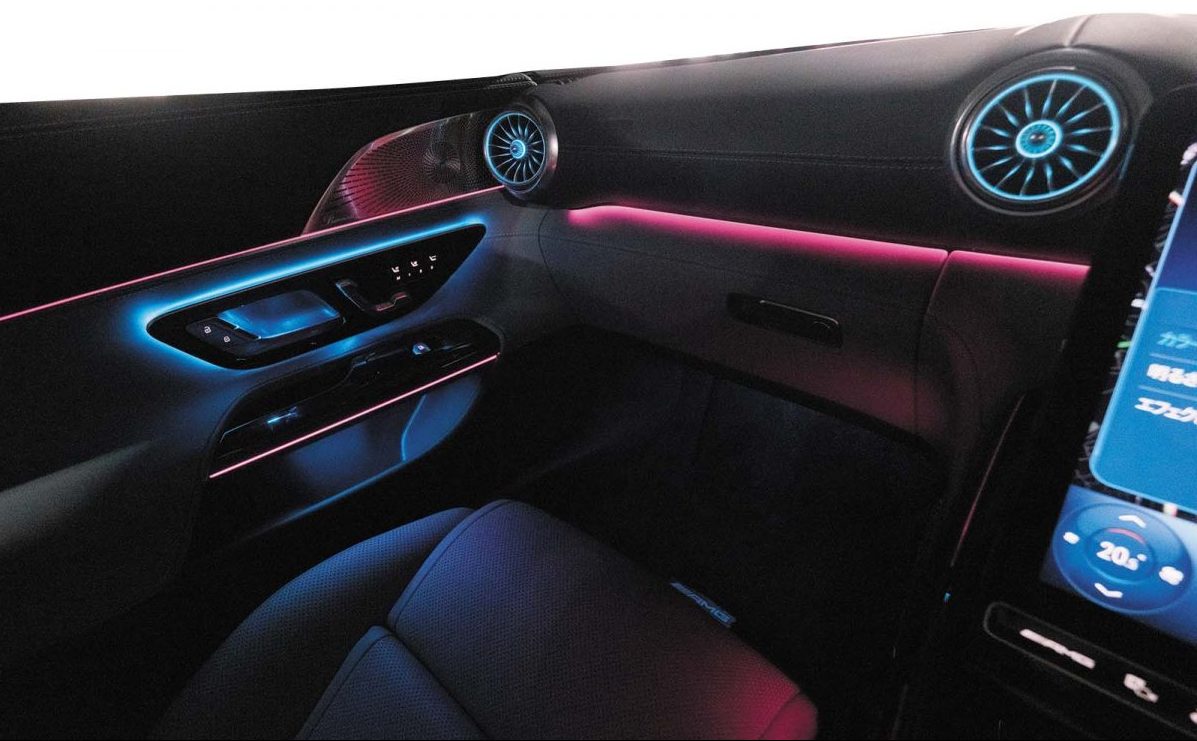 すっかりメルセデスの定番装備となった車内の間接照明です。最も小さなモデルであるAクラスにも当然のように搭載され、車内を好きなカラーで彩ることができます。単色や複数色、さらに時間で色を変化させることもできます。