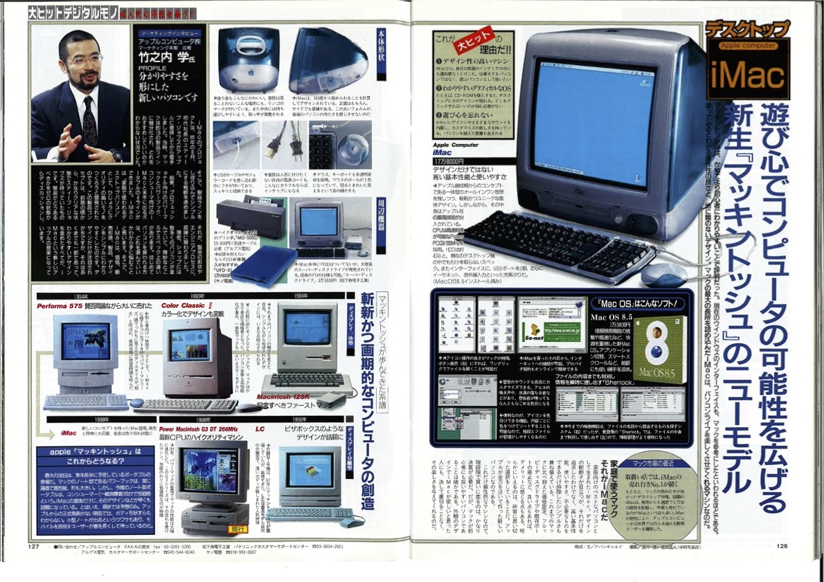 ■iMac。Appleのディスプレイ一体型デスクトップ「iMac」が登場したのが1998年。Appleに復帰したスティーブ・ジョブズが最初に発表した製品で、これまでのパソコンのイメージを一新するポップなデザインにより大ヒット。Apple復活を印象づけました。