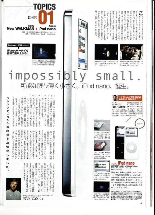 ■iPod nano。iPodの1シリーズとして登場した「iPod nano」。iPod miniの後継モデルとして位置づけられ、画面を搭載するiPodの最小モデルとして人気を集めました。