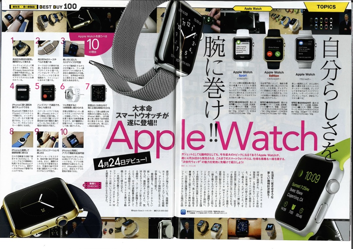 ■Apple Watch。iPhone専用のスマートウォッチ。多くのiPhone用アプリがApple Watchに対応して利便性が高く、アルミニウム、ステンレス、チタニウムを使用したボディも上質。日本ではいち早くFeliCaに対応したことから普及に拍車がかかりました。