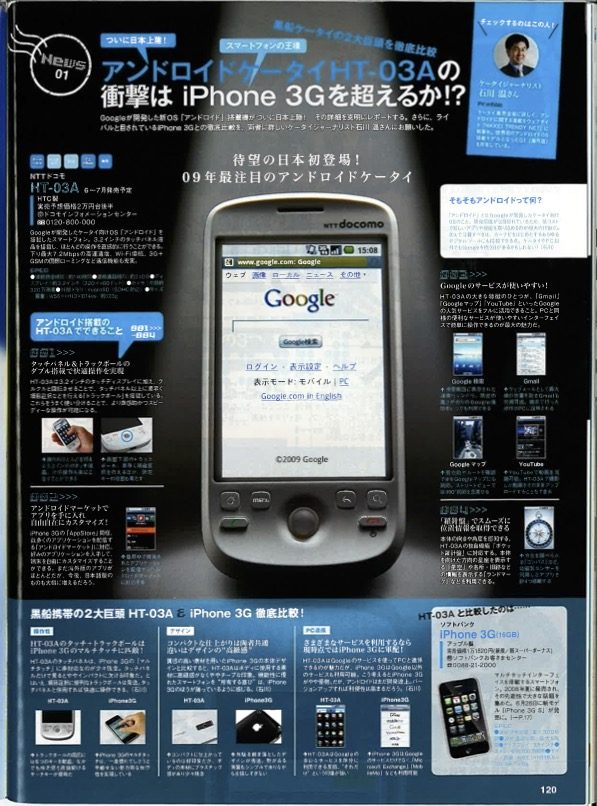 ■Android。Androidスマートフォン1号機「T-MobileG1」が米国T-Mobileより発売。この端末はキーボードを搭載しており、当初は実験的なコンセプトの製品も多かったです。現在でもAndroidは、さまざまな新技術がいち早く搭載されています。日本初のAndroidスマートフォン「HT-03A」は2009年に発売。