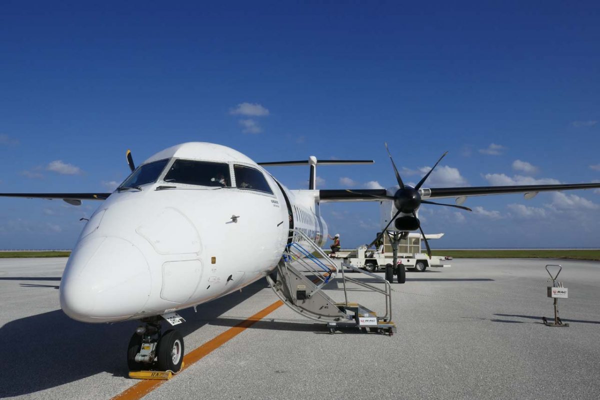 そんな南大東~北大東の空港間の距離は直線で13kmほど。わかりやすくたとえると、東京駅と羽田空港の距離に相当します。この区間を旅客機が飛んでいるのですから、フライト時間が短いのも当然ですね。使われている機材は、RACが持つ総座席数50席となるカナダのボンバルディア社製ターボプロップ機「DHC8-Q400CC」です。
