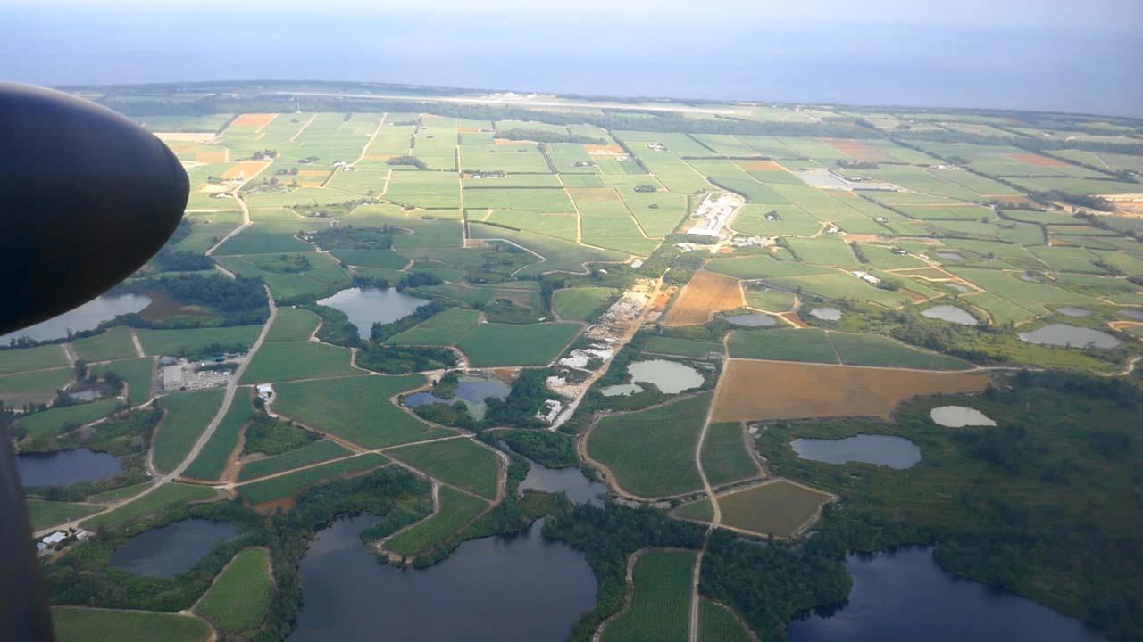 この日は、北寄りの風ということで、滑走路の南側「02」からのスタートとなりました。そのまままっすぐ行けば北大東空港ですが、この日は飛び立った後で南大東島上空を左旋回し、すり鉢状の南大東島の風景を空から眺め、眼下には旧南大東空港、そして飛び立った現南大東空港が捉えられ、その先に北大東島が見えてきました。