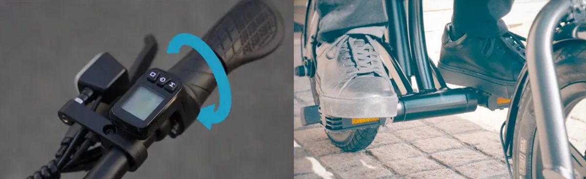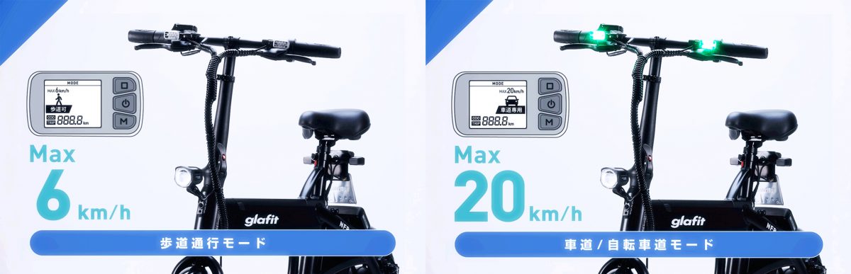 16歳以上の学生の通学からシニアのおでかけまで、幅広い世代の使用シーンが想定されているだけあって、操作性はアクセルスロットルを回すだけ、とシンプルに仕上げられている。走行モードは、最高時速20kmの「車道/自転車道モード」と同時速6km「歩道走行モード」があり、ハンドル部分に装備されたメーターのボタンで停車時に切り替えが可能。なお、ペダルはあるが、漕ぐ必要はなく足を置くだけものとなる。